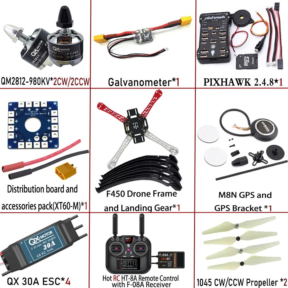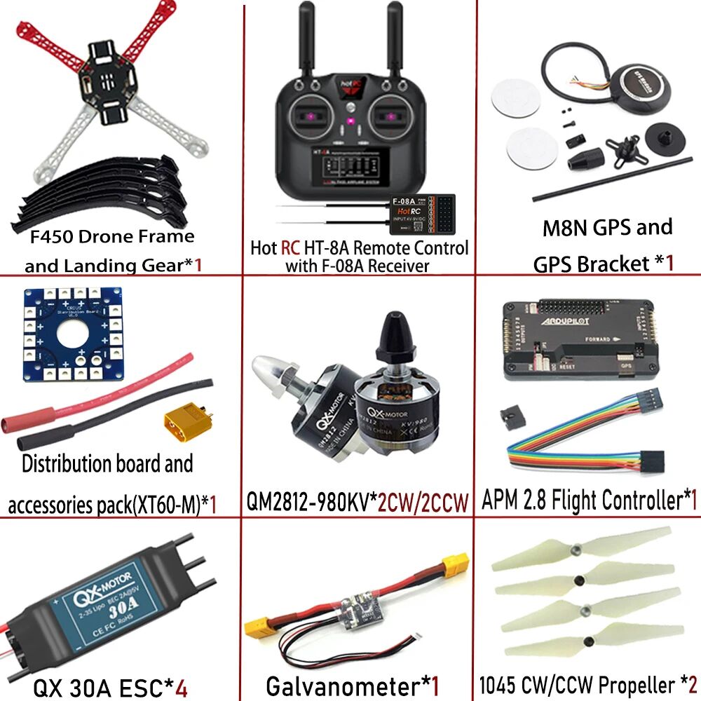 F450 4-axis Quadcopter DIY RC FPV Drone Kit with F450 Frame PXI/APM 2.8 Flight Controller 980KV Motor GPS HT-8A Transmitter F-08A Receiver